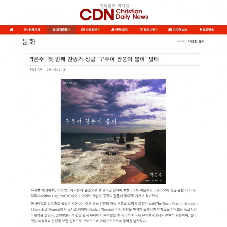 뮤직타임 [기사] 곽은주, 첫 번째 찬송가 싱글 ‘구주여 광풍이 불어’ 발매(기독일보 씨디엔)