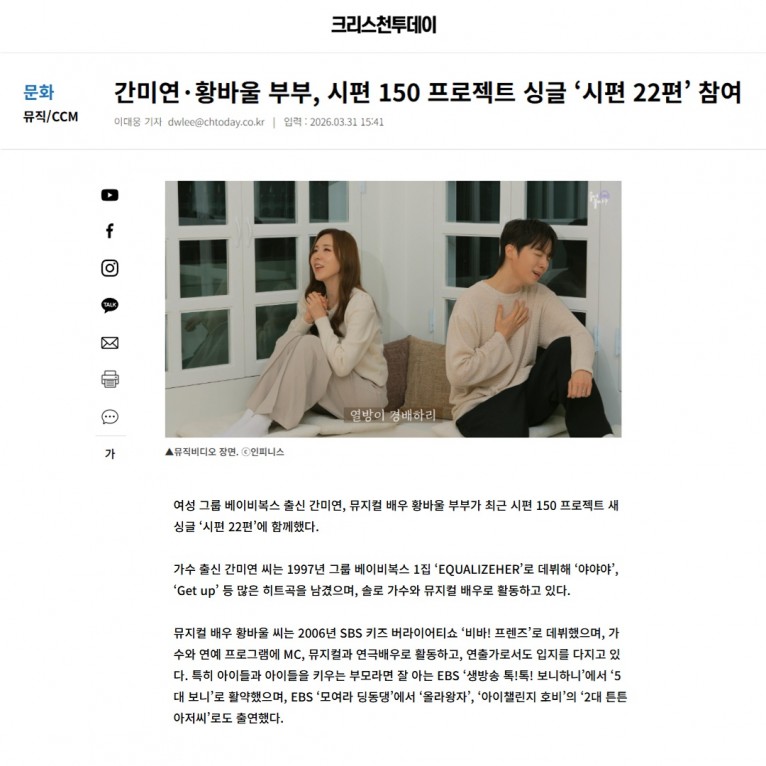 [기사] 간미연·황바울 부부, 시편 150 프로젝트 싱글 ‘시편 22편’ 참여(크리스천투데이)