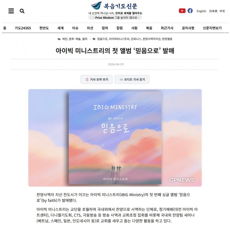 뮤직타임 [기사] 아이빅 미니스트리의 첫 앨범 ‘믿음으로’ 발매(복음기도신문)