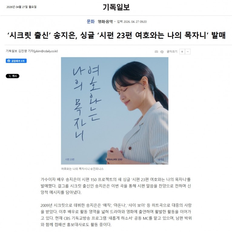 뮤직타임 [기사] ‘시크릿 출신’ 송지은, 싱글 ‘시편 23편 여호와는 나의 목자니’ 발매(기독일보)