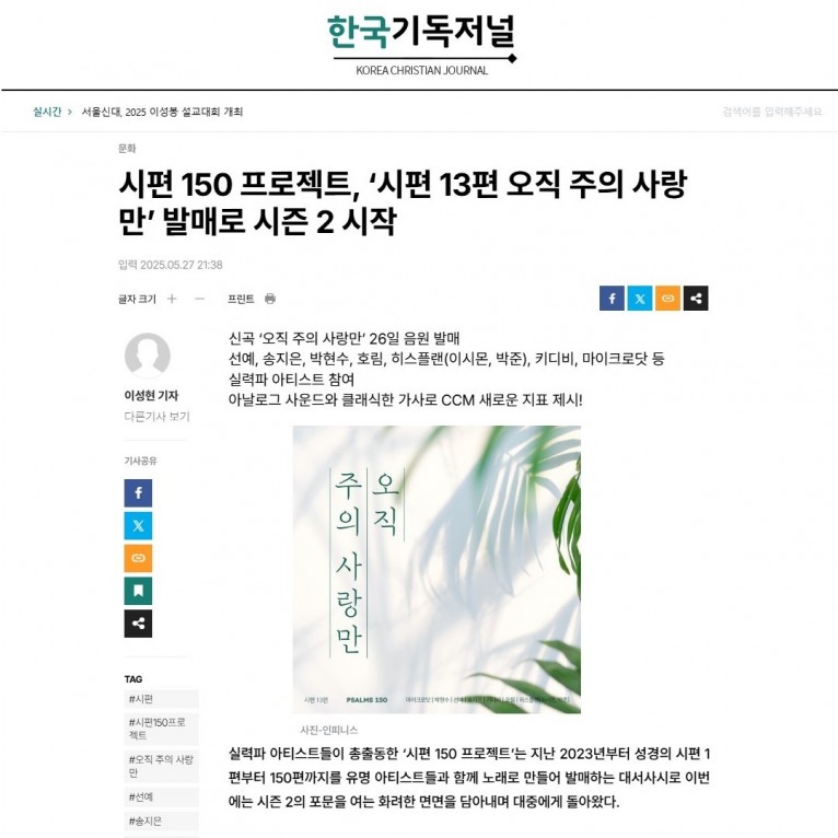 뮤직타임 [기사] 시편 150 프로젝트, ‘시편 13편 오직 주의 사랑만’ 발매로 시즌 2 시작(한국기독저널)